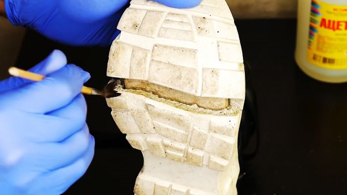 Первым делом тщательно с губкой и мылом отмоем подошву от всех уличных загрязнений.