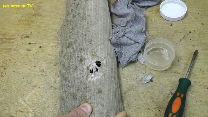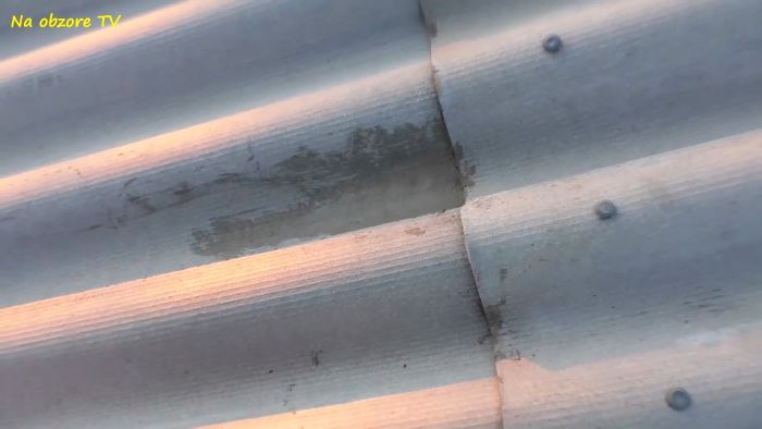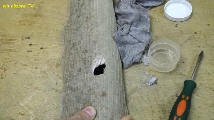 На заранее очищенные от загрязнений и просушенные края повреждений в шифере наносим полученную липкую массу и накрываем дефектное место с перекрытием кусочком тканевого материала, слегка придавливая его к клею под ним.