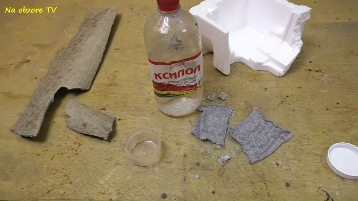 В небольшую пластиковую емкость наливаем необходимое количество растворителя. Это может быть обыкновенный ксилол или распространенный растворитель Р-650. Опускаем в него соразмерный кусочек пенопласта, слегка вдавливая и помешивая.