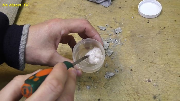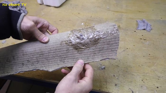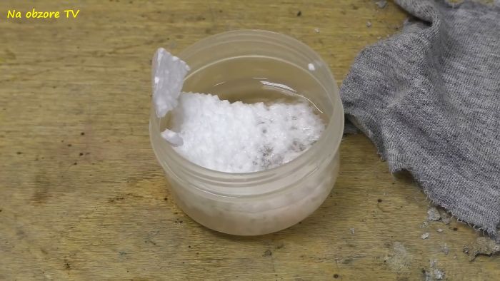 Пенопласт частично растворяется, превращаясь в желеобразную массу, которую при получении необходимого количества, вытаскиваем из растворителя и слегка сушим, отжимая с помощью ткани.