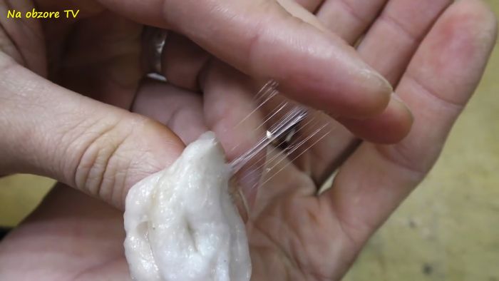 В результате в наших руках оказывается белая по цвету, очень липкая субстанция, которая накрепко пристает ко всему, в том числе и к рукам, поэтому с ним надо обращаться с предельной осторожностью.