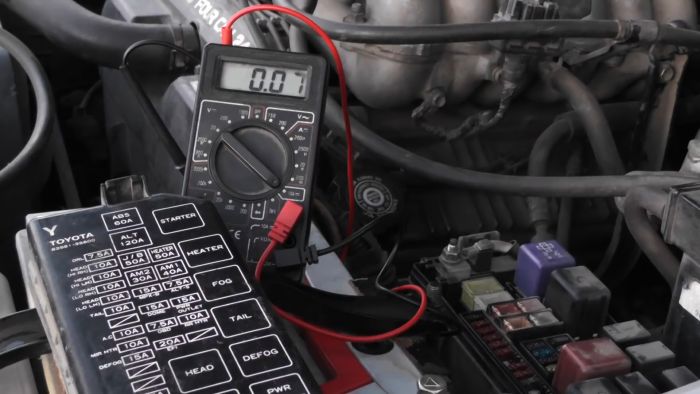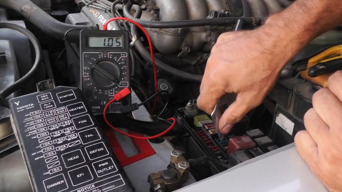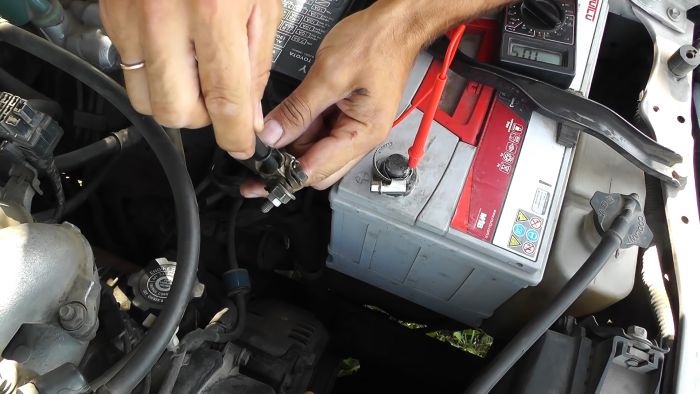 Второй щуп мультиметра присоединяется к снятой из аккумулятора клемме. Если с батареи снимался плюс, то важно смотреть чтобы клемма не контактировала с проводниками. Если есть такая возможность, то лучше снимать массу для подключения мультиметра, так будет безопасней для проводки.