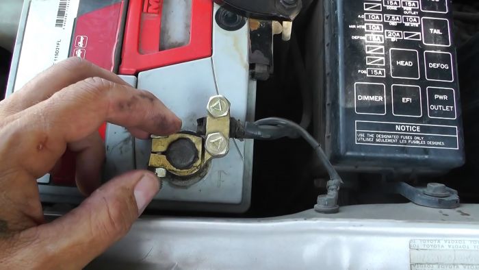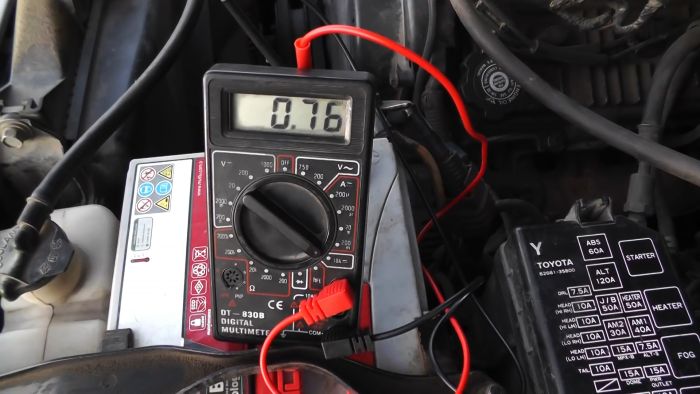 Для начала нужно определить насколько большая утечка тока происходит при выключенном зажигании. Для этого необходимо снять одну из клемм аккумулятора и зажать на его контакт с помощью хомута щуп мультиметра.