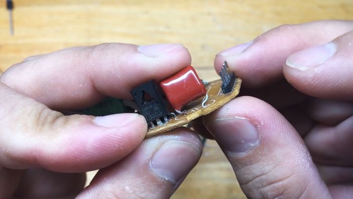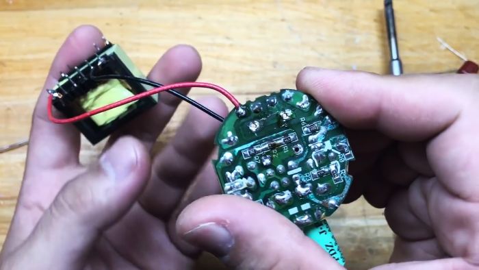 Припаиваем один из проводов к соответствующему трансформаторному выводу на плате, а второй – к одному из выводов неполярного конденсатора C3.
