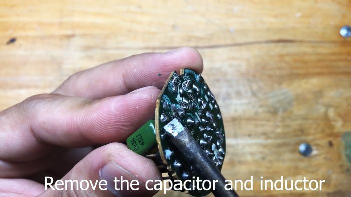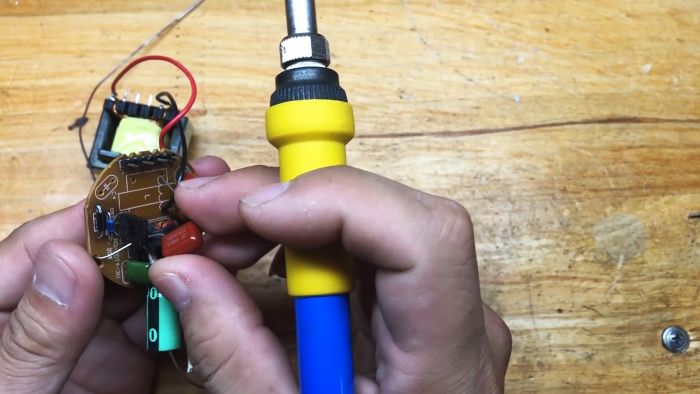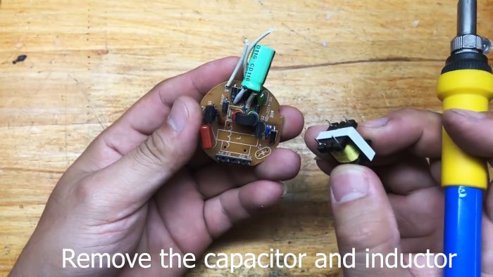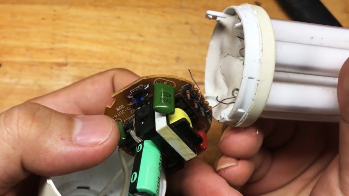 - Плата с деталями из сгоревшей энергосберегающей лампы.