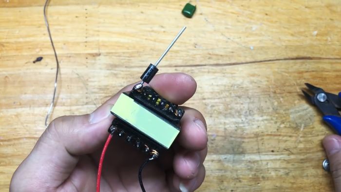 Далее берём диод и подсоединяем его к трансформатору на выходе. Готово!
