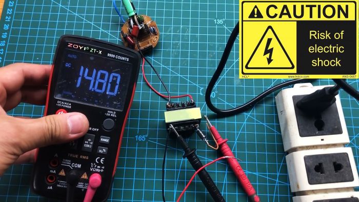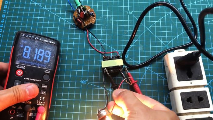 Можно подавать 220 Вольт, а заодно для проверки системы подсоединить тестер. Без нагрузки он показывает постоянное напряжение 12-15 Вольт.