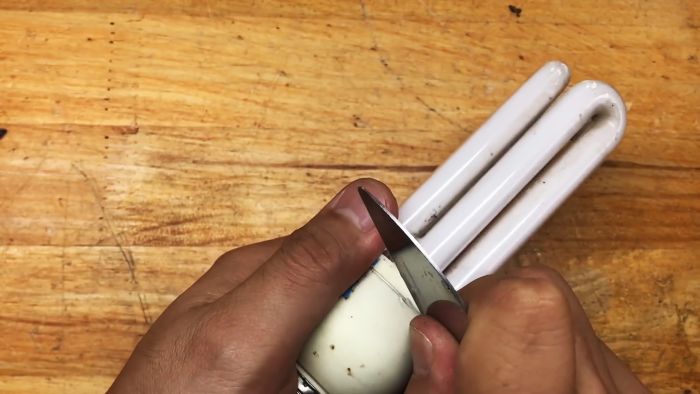 Итак, приступаем. Берём неработающую лампу (например, на 20 Ватт) и вскрываем её пластиковый корпус при помощи ножа.