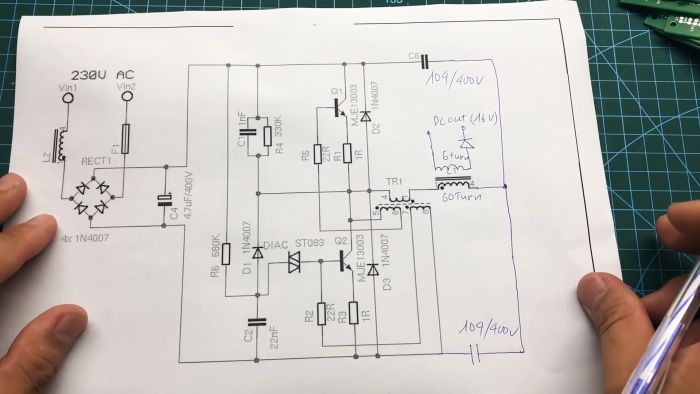И внести в неё изменения: на эскизе убрать спираль и один из высоковольтных конденсаторов, добавить перемотанный трансформатор с диодом и пленочным конденсатором.