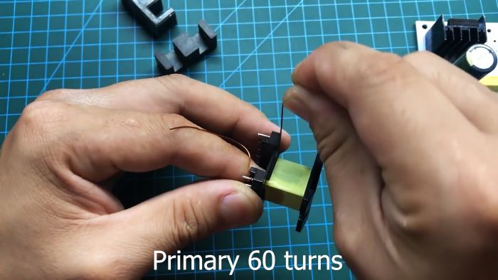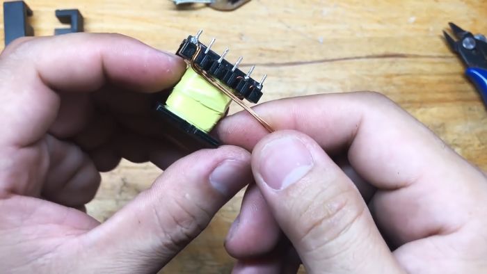 Перематываем катушку трансформатора: первичку – 60 витков провода сечением примерно в 0,5 кв. мм, а вторичку – 6 витков таким же проводом, но сложенным в четыре жилы.