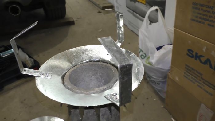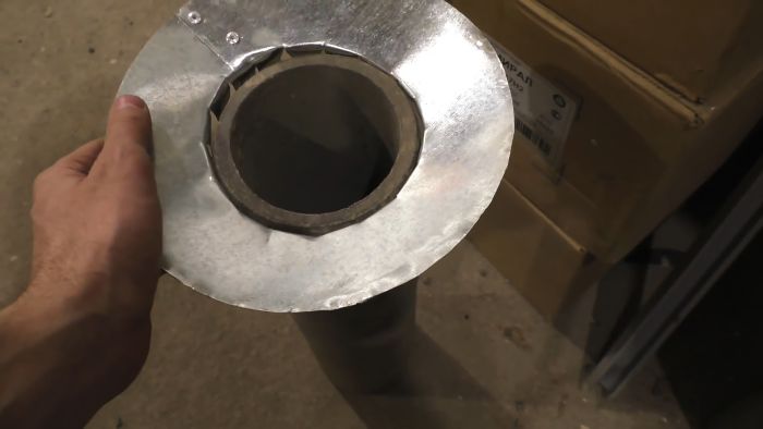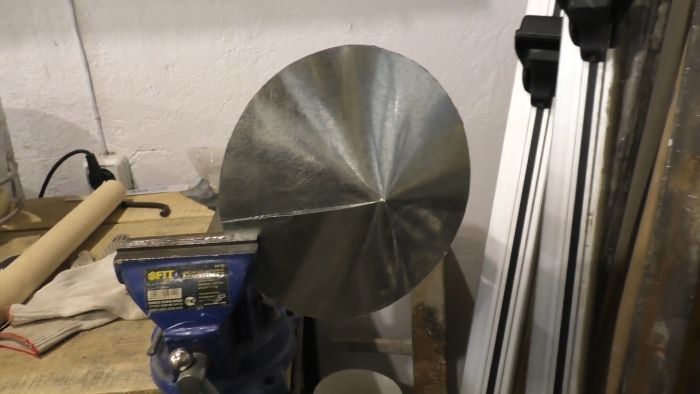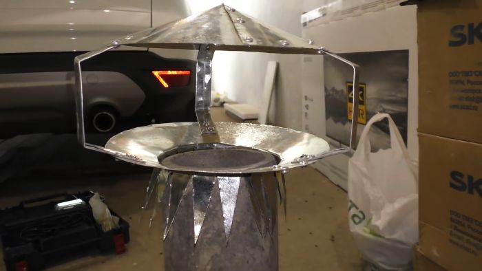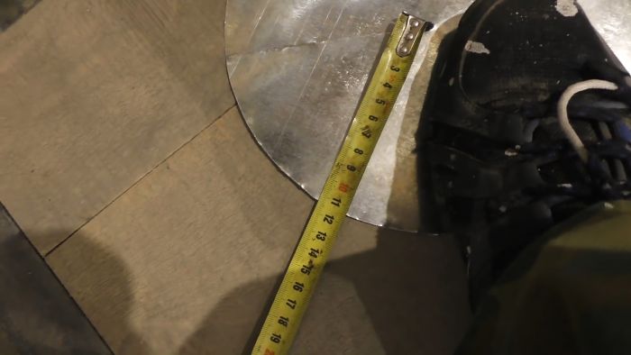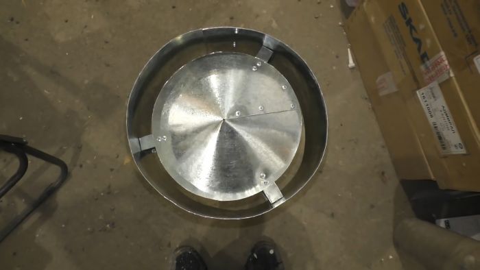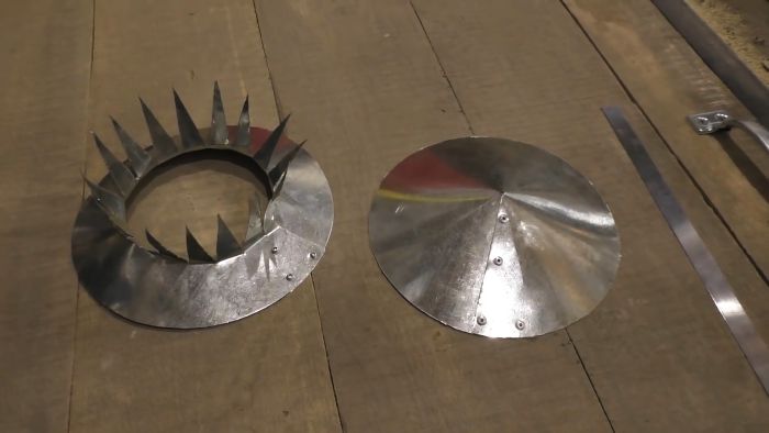 Из такого же диска изготавливается крепление дефлектора к трубе. Он распиливается от центра для образования треугольных зазубрин, которые выгибаются наружу. Здесь все рассчитывается так, чтобы получить отверстие под используемую на вытяжке трубу. Оставшуюся по окружности полосу металла нужно разрезать, и стянуть заклепками под конус.