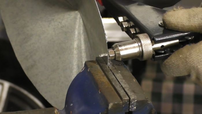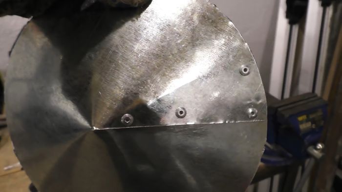 В завершение закрепляется экран из полосы, сделанной первой. Он накручивается вокруг дефлектора, и фиксируется на стойках заклепками.