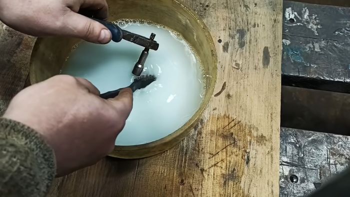 Затем заготовка тщательно вымывается в растворе порошкового чистящего средства. Оно обезжирит поверхность, и позволит присоединять к ней хром.