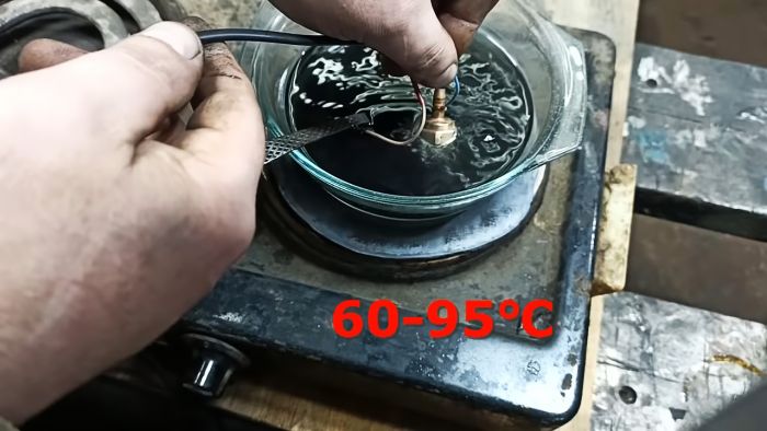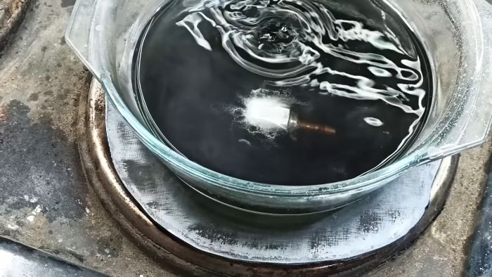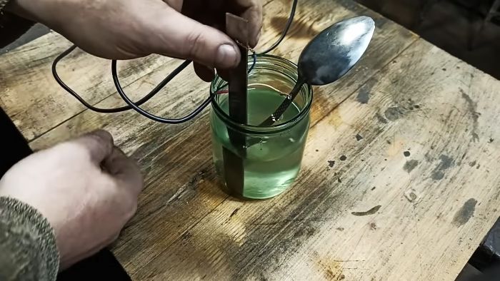 Электролит в стеклянной емкости необходимо разогреть до температуры 60-95 градусов Цельсия, к примеру, поставив электрическую плиту. Затем в него окунается электрод из нержавейки более высокого качества, в данном случае ложка, и деталь для хромирования. На электрод подключается минус от источника питания, а на заготовку плюс. Скорость хромирования зависит от мощности применяемого трансформатора или зарядного.