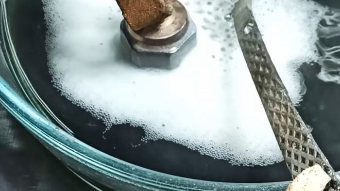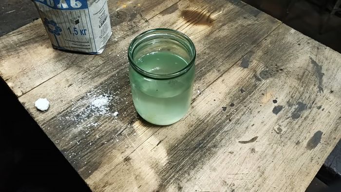 В стеклянную емкость наливается уксус в таком объеме, чтобы полностью покрыть деталь для хромирования. Сверху засыпается пищевая соль в расчете горсть на 0,5 л уксусной кислоты.
