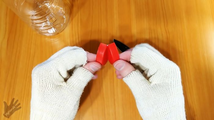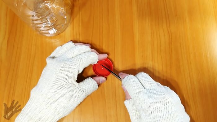 Для роспуска потребуется пластиковая крышка от бутылки. Она режется по бортикам пополам, затем сгибается по насечкам наружу.