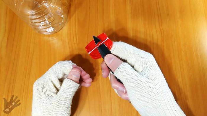 У бутылки отрезается горловина. Затем нож с крышкой прикладывается к ее кромке. Стенка должна войти в щель между половинками крышки. После этого режем ее на ленту. Когда та выйдет, нужно за нее ухватиться и потянуть прижимая инструмент вниз.
