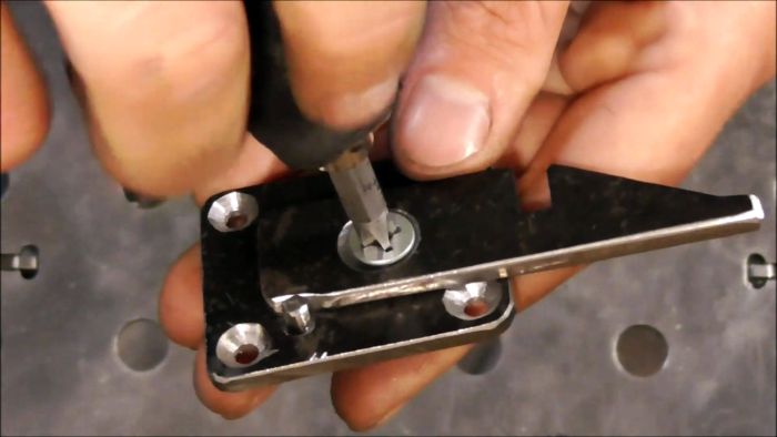 Укладываем засов-поводок на пластину и закрепляем с помощью винта с потайной головкой так, чтобы он мог свободно поворачиваться в вертикальной плоскости, упираясь лишь в ограничитель.