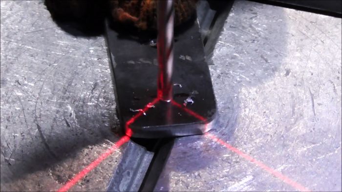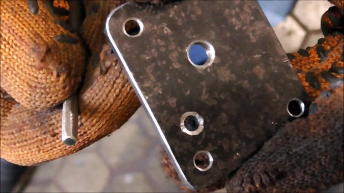 После накернивания всех отмеченных точек, выполняем отверстия на сверлильном станке и зенкуем их под головки винтов и шурупов. В центральном отверстии в пластине нарезаем с помощью метчика и воротка резьбу.
