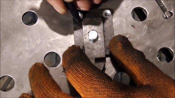 Вставляем в это небольшое отверстие с натягом штифт, оставляем с лицевой стороны высоту, равную толщине засова. Снизу пластины штифт расплющиваем и зачищаем болгаркой.