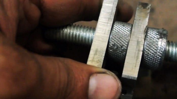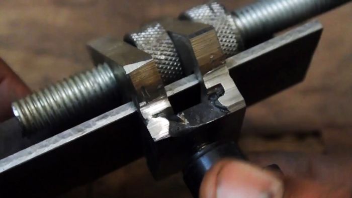 Между деталями из квадрата помещаем круглую гайку с накаткой и вкручиваем шпильку. Снаружи на шпильку наворачиваем такую же гайку.