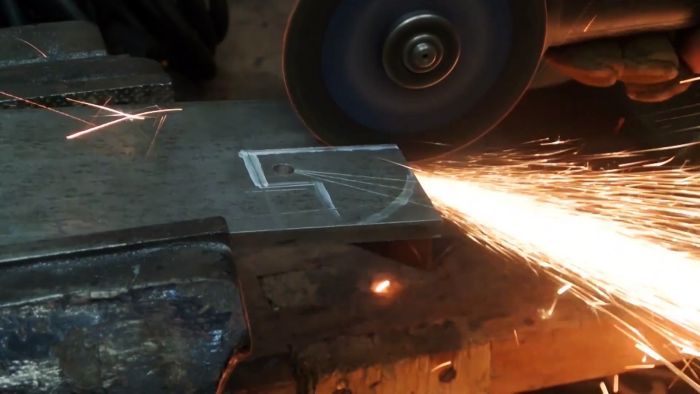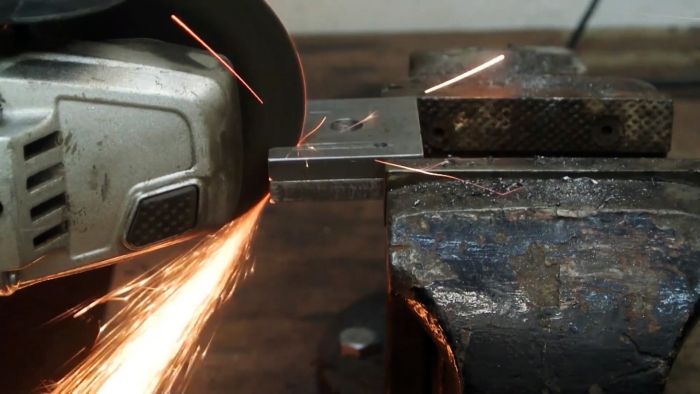 В другом квадрате делаем вырез, над ним сверлим отверстие и скругляем по дуге окружности угол. В вырез симметрично и продольно ставим основание шарнира и привариваем.