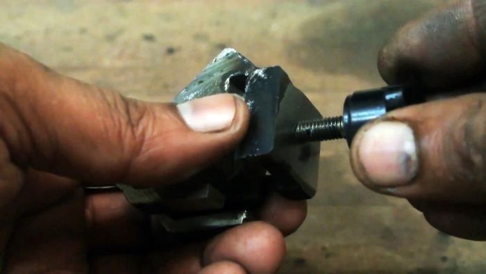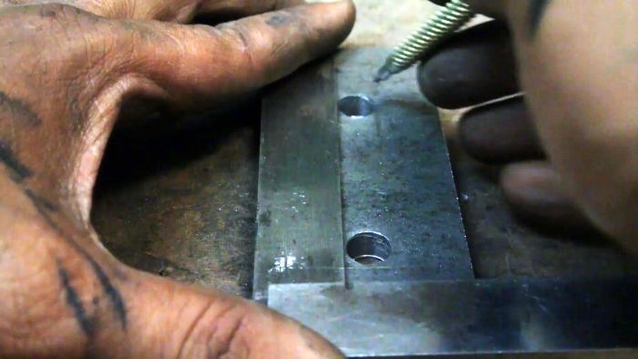 Со скошенной под углом стороны уголка привариваем к полкам стальное полукольцо с резьбой в центре, к косому срезу полки – пластину с двумя отверстиями и под полукольцом к линии схождения полок – стальное ушко с отверстием.