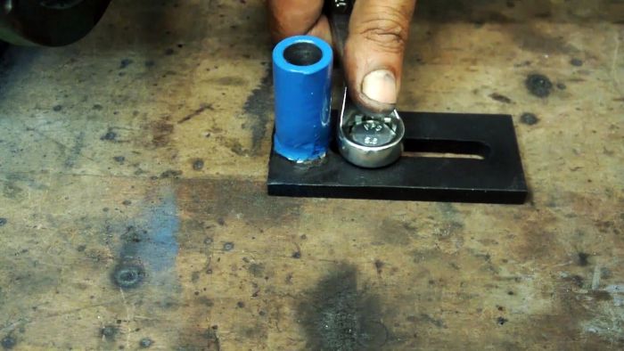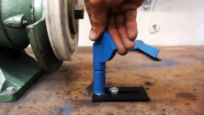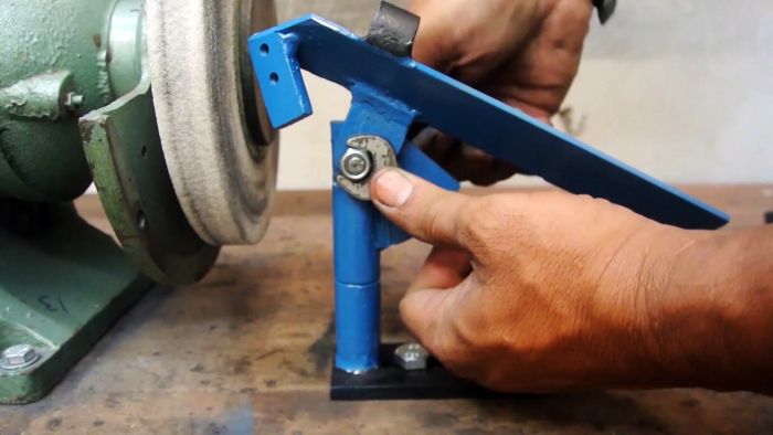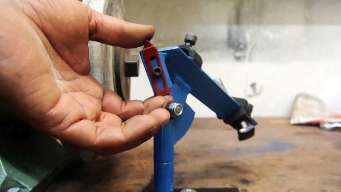 Прямоугольную пластину с основанием шарнира обычным болтом крепим к отверстию в верстаке на расчетном расстоянии от наждачного круга.