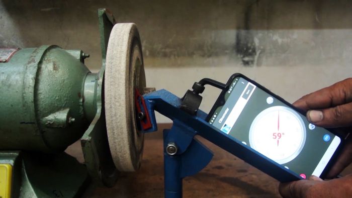 Ориентируем направляющий уголок под 60 градусов к плоскости наждака и прочно закрепляем его.