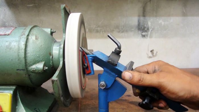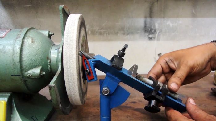 Включаем наждак и затачиваем сверло, поворачивая приспособление относительно наждака.
