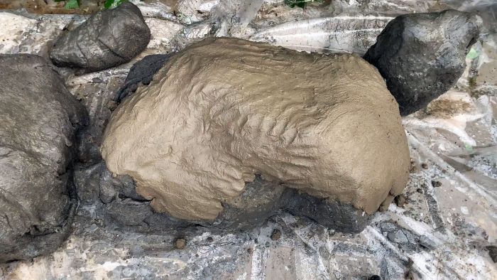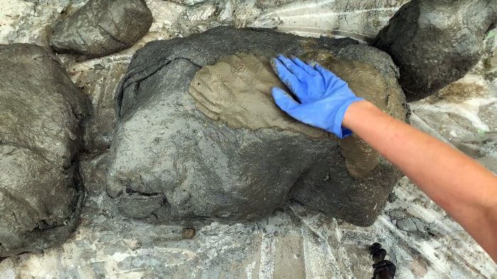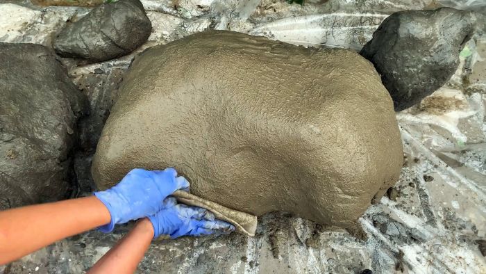 Оштукатурив таким способом камень, нужно доработать его рельеф. Удачный результат дает прикладывание на поверхность вспененного полиэтилена. Он оставляет реалистичный отпечаток. Через 48 часов камень можно перевернуть, и сделать таким же способом дно.