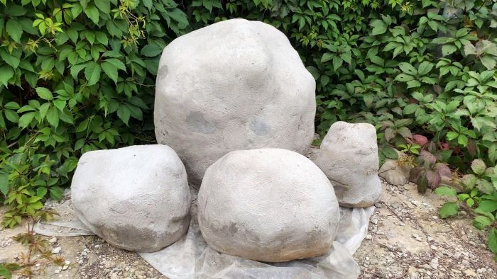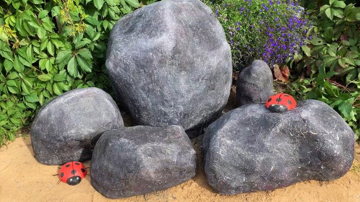 При обустройстве ландшафта часто не хватает красивых больших камней, возле которых отлично смотрятся кустарники или кустики цветов. Подобные глыбы имеют массу в сотни килограмм, поэтому доставить их на участок своими силами никак не получится. В таком случае можно попросту сымитировать камни из бетона и пластиковых бутылок. Выглядят они также, но при этом легко перемещаются.