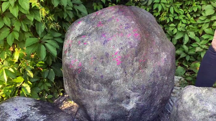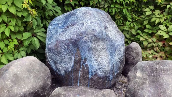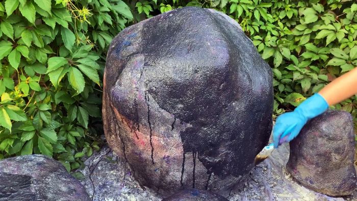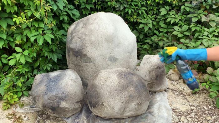 Далее предстоит окрашивание, чтобы придать бетону реалистичность настоящего камня. Для этого он покрывается грунтовкой с добавлением черного колера. Она набрызгивается опрыскивателем. Вторым слоем после высыхания первого наносится грунтовка с колером ирис.