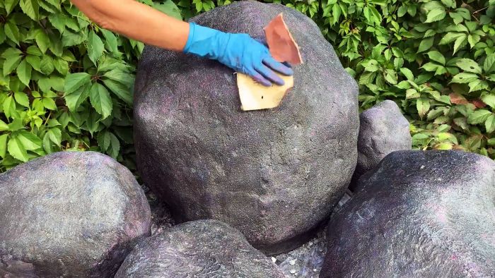На второй день камень станет светлее, чем был изначально после последнего слоя грунтовки. На нем снова проявятся цветные вкрапления. После этого его можно немного доработать шкуркой, убрав острые наплывы бетона. Такие потертости улучшат его внешний вид.