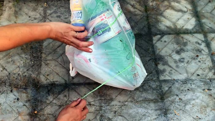 В пакет или мешок помещаем пластиковые бутылки. Затем обвязываем его шнурком, чтобы выделить рельеф.