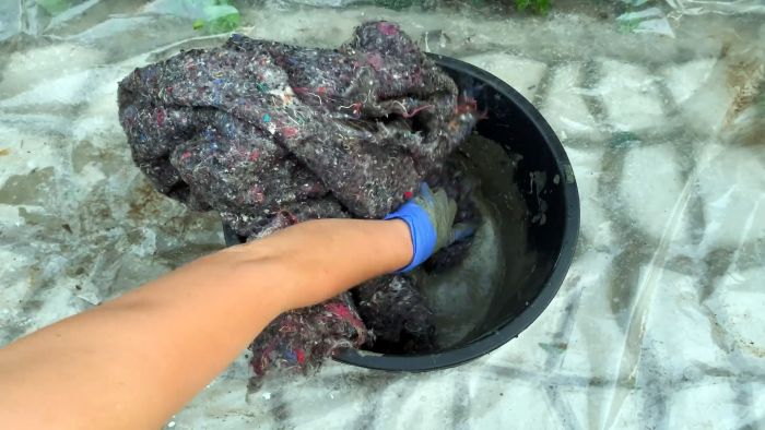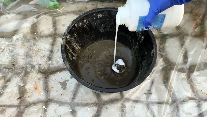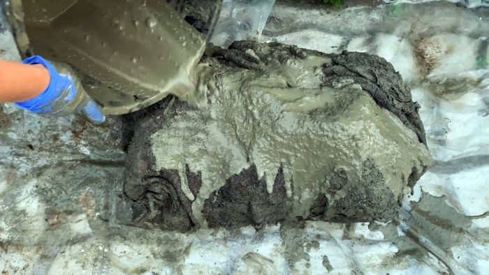 Далее замешиваем цементный раствор. В цемент добавляется только вода, и немного клея ПВА для пластичности. Нужно сделать жидкий состав, и вымочить в нем большой кусок ветоши либо мешковину.