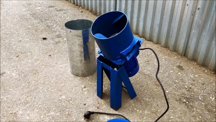 Цилиндрический корпус камеры измельчения делается из трубы большого диаметра, бочки, либо выгибается и сваривается с листовой стали. Внизу к нему приваривается 4 проушины, чтобы прикуривать его к пластине на моторе. Сбоку, напротив ротора, вырезается окно для выброса измельченной травы. Изнутри в цилиндрический корпус приваривается 2 направляющие воздушного потока. Они усилят завихрения, необходимые для выброса сечки.