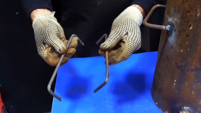 Сгибаем из них две скобы и вновь укладываем на трубу 22×37 см загибами вниз и в таком положении привариваем к крышке трубы.