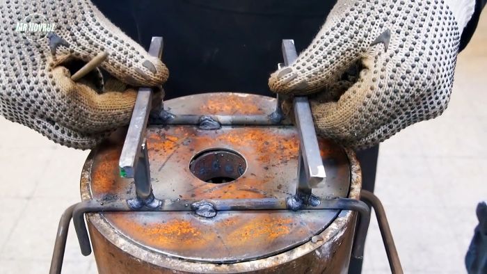 Полученную конструкцию устанавливаем по центру на дно трубы 22×37 см и привариваем прутья к дну трубы.
