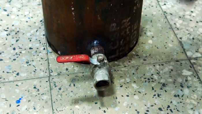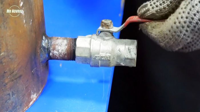 Внизу вертикально установленной трубы 22×37 см с уже приваренным дном и переносными ручками по сторонам вырезаем отверстие, вставляем в него трубный сгон резьбой наружу и косым срезом внутрь и вверх.