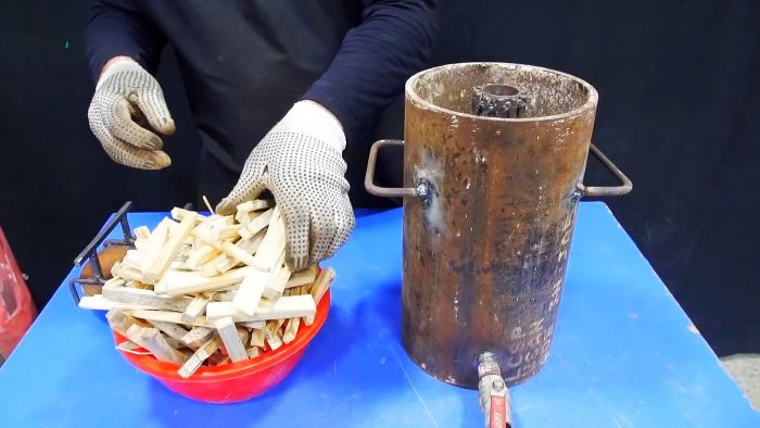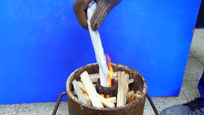 В качестве растопки используем скомканный лист бумаги, который поджигаем, и бросаем внутрь решетчатой конструкции. При этом вентиль на сгоне внизу открываем.