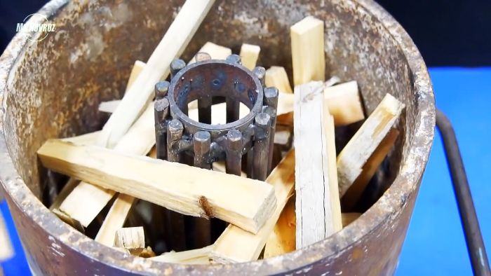 В кольцевое пространство между корпусом ракетной печи и решетчатой кольцевой конструкцией помещаем древесное топливо.