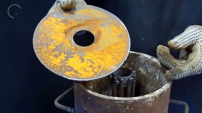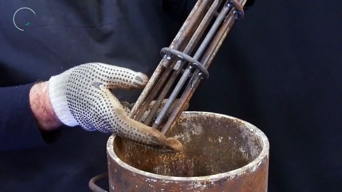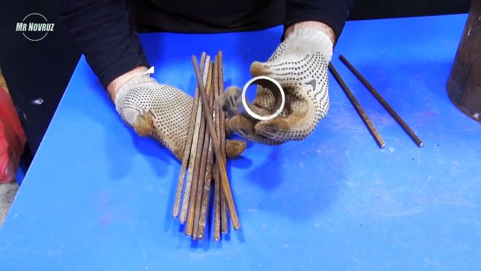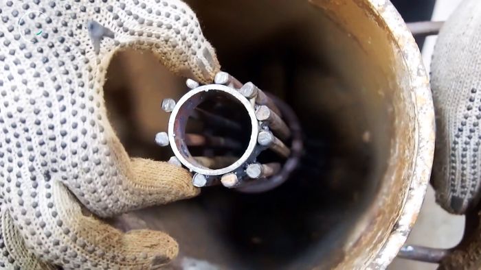 Нарезаем из круглого прутка одинаковые по длине отрезки немного короче высоты трубы в количестве 11 штук. Равномерно и вертикально привариваем их одним концом к внешней образующей стального цилиндрического кольца.