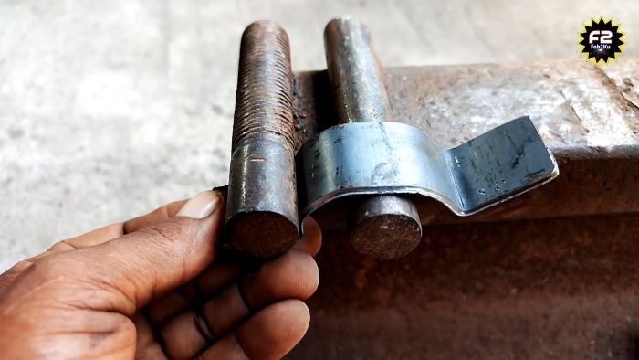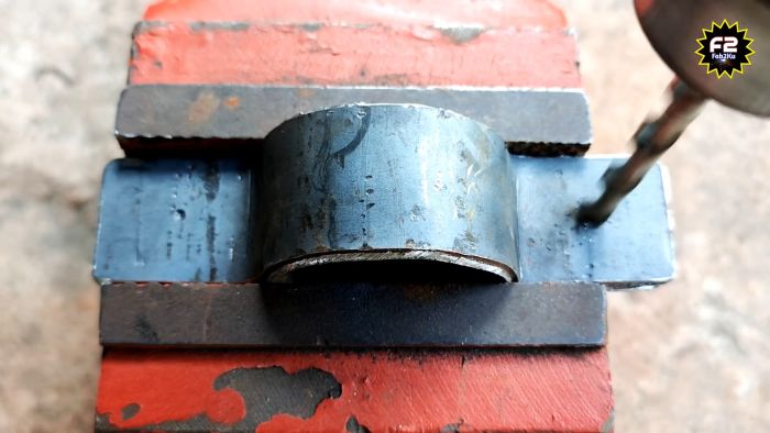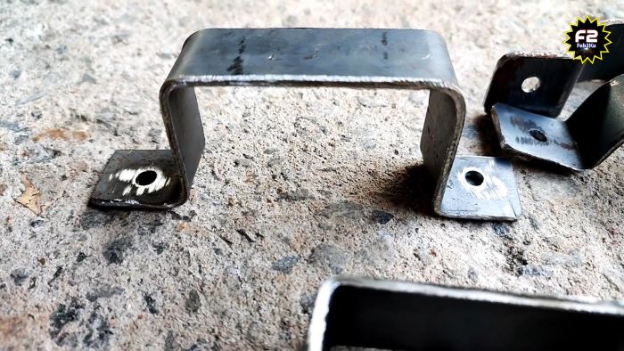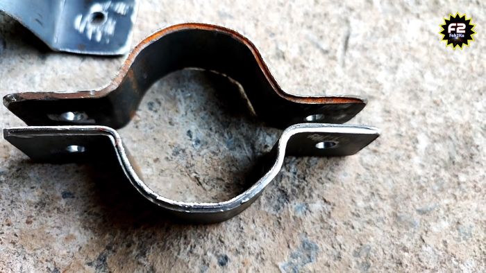 Теперь остается только просверлить проушины. Этим способом можно делать хомуты как для круглых, так и профильных труб. Во втором случае их после изгиба не нужно скруглять. П-образные скобы к тому же можно применять как ручки для ящиков и дверей.