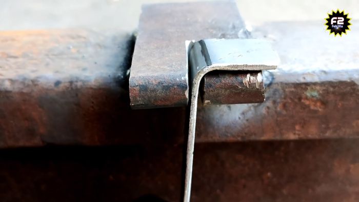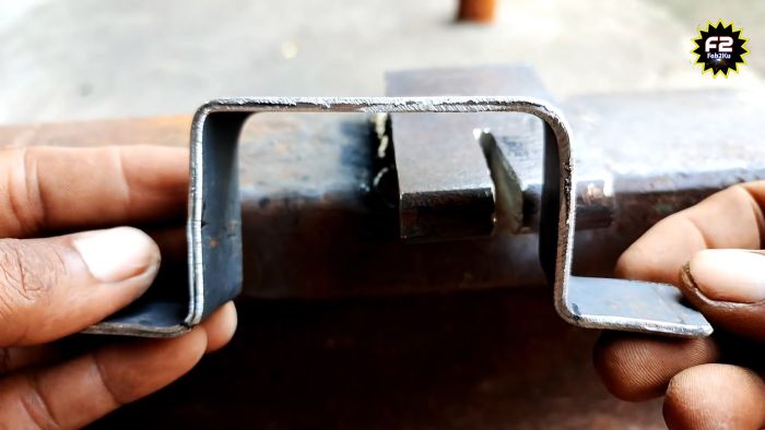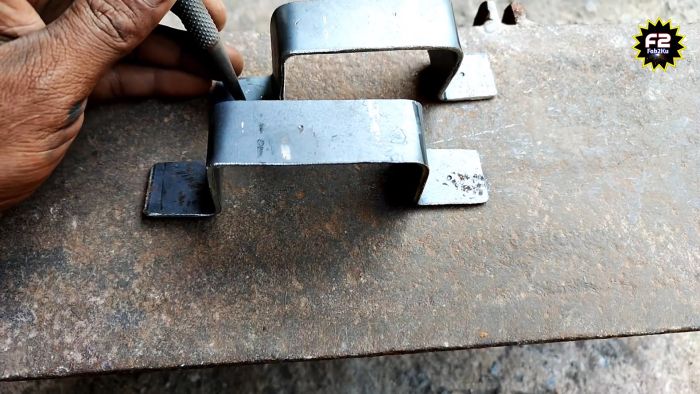 Теперь полоса вставляется по меткам в разрез устройства, и с помощью молотка выгибается. Сначала гнутся проушины, потом делаются углы на оставшихся метках.
