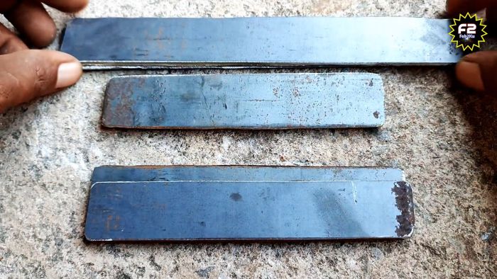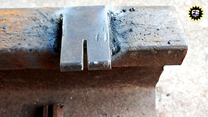 Полученная заготовка приваривается плашмя на рельс так, чтобы пропил остался открытым. Вместо рельса можно применять наковальню, или прикрутить деталь к большой тяжелой деревянной колоде.