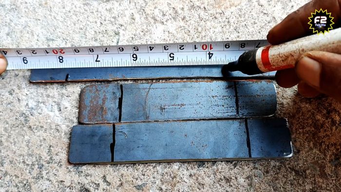 Чтобы воспользоваться устройством, нужно подготовить и разметить стальные полосы. Их длина должна составлять половину окружности трубы, для которой делается хомут, и плюс по 20-25 мм на проушину с каждого конца. На одной стороне заготовки ставятся 2 метки для изгиба проушин, а на второй еще пара, чтобы при изгибе по ним получить в итоге П-образную скобу.