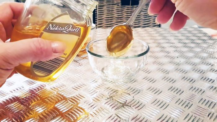 Берем небольшую чашечку и добавляем в нее ложку меда.
