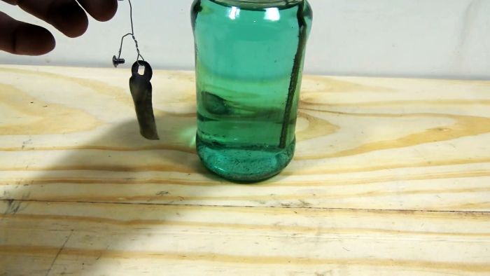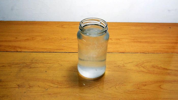 В стеклянной банке приготавливаем водный раствор электролита с добавлением столового уксуса и поваренной соли в определенных пропорциях, и все тщательно перемешиваем ложкой до полного растворения соли.