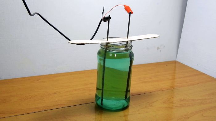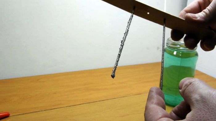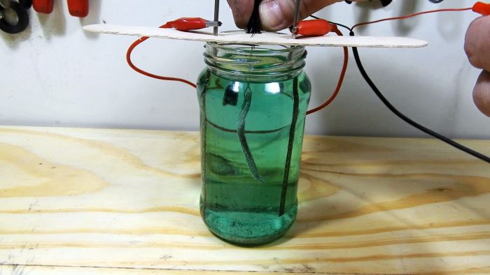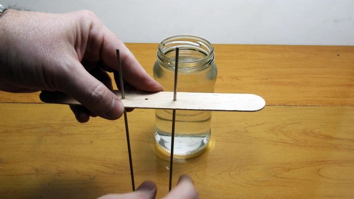 В деревянной дощечке (это может быть палочка из-под мороженного) по центру проделываем три отверстия. В крайние отверстия помещаем электроды и опускаем их в электролит, и подключаем напряжение.